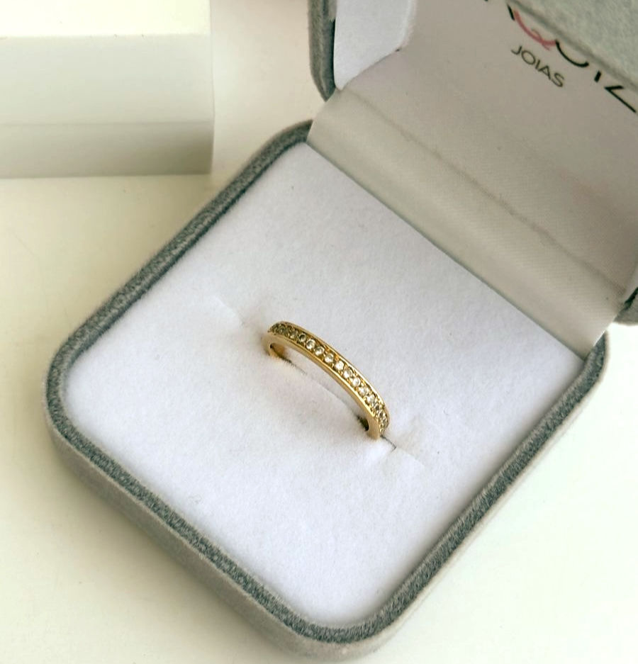 O efeito diamantado na aliança é feito depois que o aro foi escovado. Então, uma ponta de diamante corta o metal, de modo que fique parecendo que a peça está cravejada por diamantes. A textura da peça será a de grãos de areia.